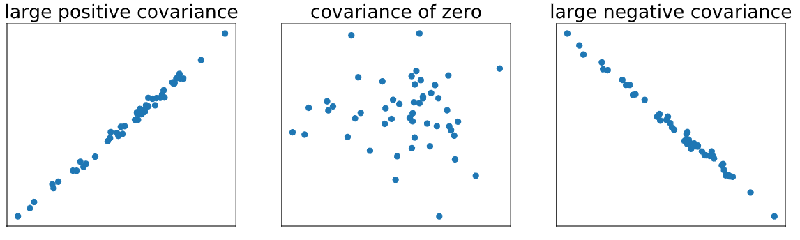 La covarianza puede variar desde infinito negativo hasta infinito positivo. Una covarianza positiva indica que un valor mayor de una variable está asociado con un valor mayor de la otra. Una covarianza negativa indica que un valor mayor de una variable está asociado con un valor menor de la otra. Una covarianza de 0 indica que no hay relación lineal. Aquí hay unos ejemplos: