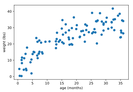 Es importante señalar que diferentes tipos de asociaciones pueden conducir a diferentes patrones en un diagrama de dispersión. Por ejemplo, el siguiente gráfico muestra la relación entre la edad de un niño en meses y su peso en libras. Podemos ver que los niños mayores tienden a pesar más pero que la tasa de crecimiento comienza a estabilizarse después de los 36 meses: