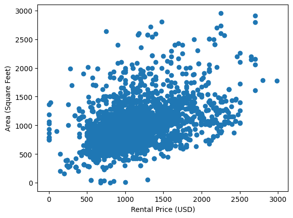 Una de las mejores formas de visualizar rápidamente la relación entre variables cuantitativas es compararlas entre sí en un diagrama de dispersión. Esto facilita la búsqueda de patrones o tendencias en los datos. Comencemos trazando el área de un alquiler con respecto a su precio mensual para ver si podemos detectar algún patrón.
