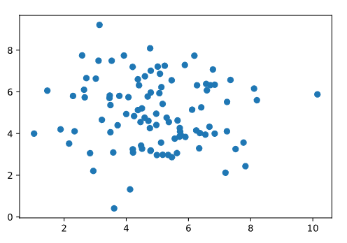 Si no vemos ningún patrón en un diagrama de dispersión, probablemente podamos suponer que las variables no están asociadas. Por ejemplo, un diagrama de dispersión como este no sugeriría ninguna asociación: