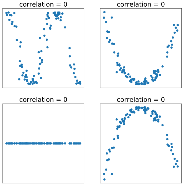 Por ejemplo, los cuatro diagramas de dispersión siguientes muestran pares de variables con correlaciones cercanas a cero. La imagen inferior izquierda muestra un ejemplo de una asociación lineal perfecta donde la pendiente es cero (la línea es horizontal). Mientras tanto, los otros tres gráficos muestran relaciones no lineales: si trazáramos una línea a través de cualquiera de estos conjuntos de puntos, ¡esa línea tendría que ser curva, no recta!